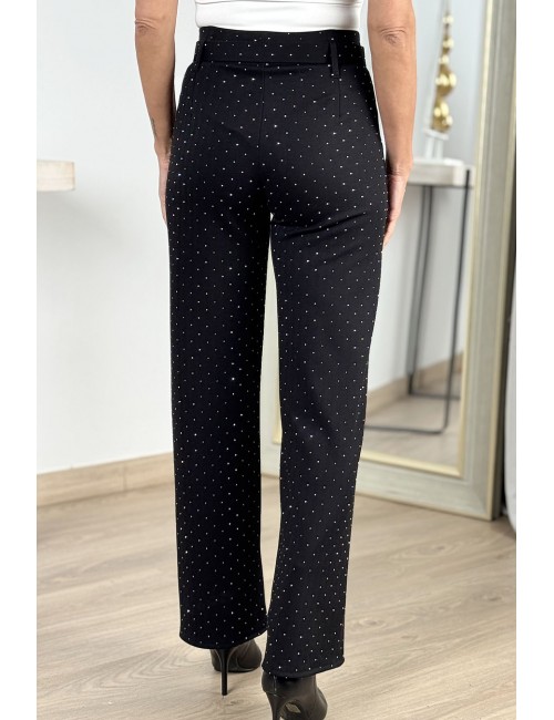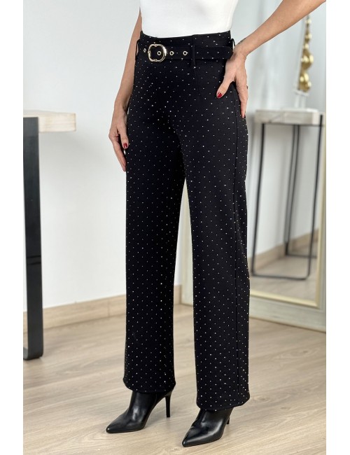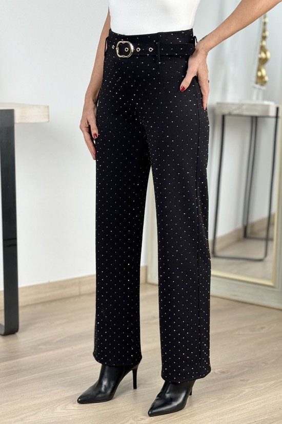 Pantalón palazzo de tiro alto confeccionado en tejido texturado en espiga con brillantitos. Cinturón téxtil del mismo tejido cn hebilla y ojales dorados. Un pantalón cómodo y original, ideal para ocasiones especiales y eventos.