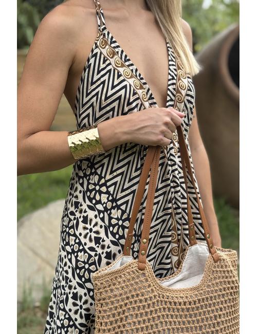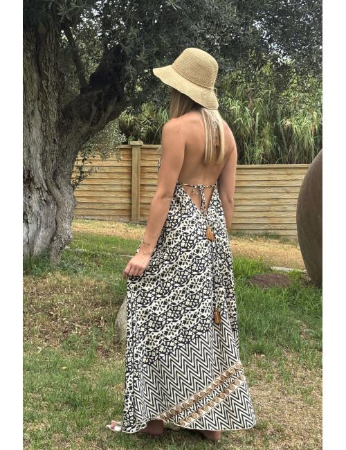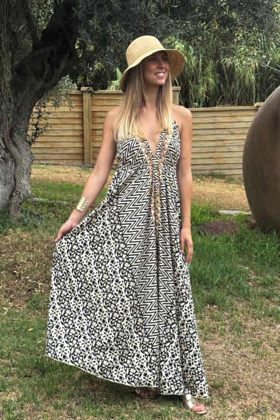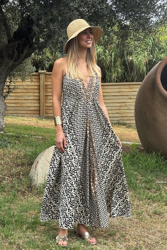 Vestido largo de estilo boho, con escote frontal en forma de V. Estampado con motivos florales. Atado al cuello y espalda y te lo puedes ceñir en la cintura. El escote es pronunciado en la espalda. Este vestido está confeccionado en un tejido sedoso especialmente suave y fresquito. Además tiene una caída preciosa, sienta de maravilla y es ideal para la época estival.