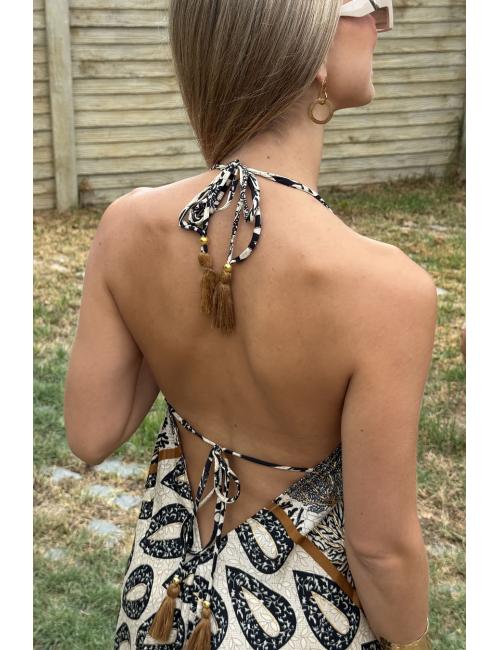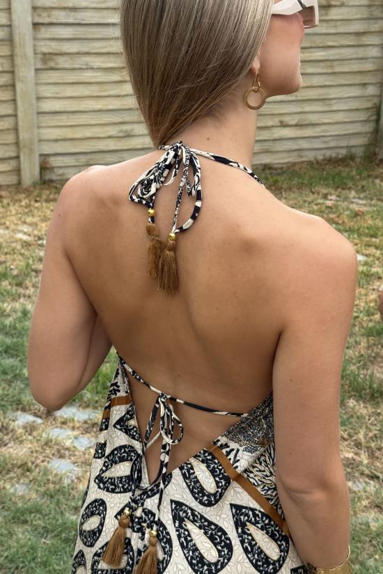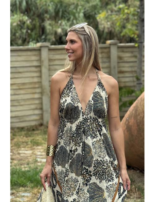 Vestido largo de estilo boho, con escote frontal en forma de V. Estampado con motivos florales. Atado al cuello y espalda y te lo puedes ceñir en la cintura. El escote es pronunciado en la espalda. Este vestido está confeccionado en un tejido sedoso especialmente suave y fresquito. Además tiene una caída preciosa, sienta de maravilla y es ideal para la época estival.