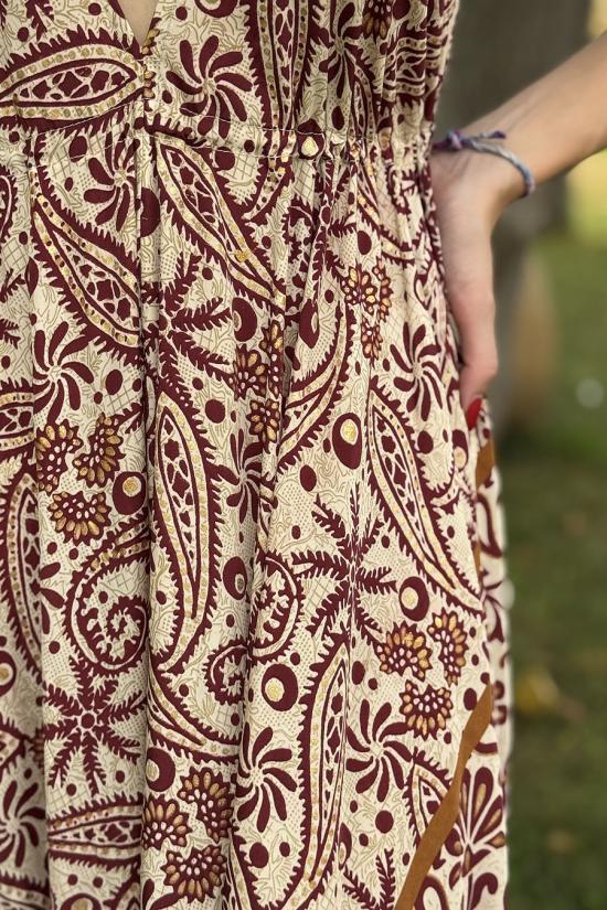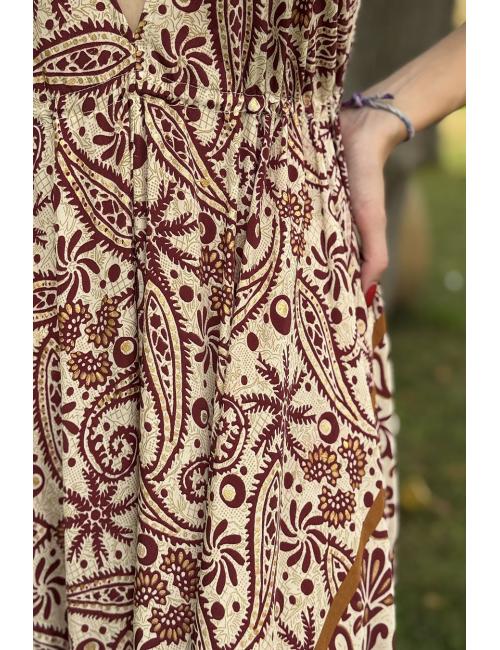 Vestido largo de estilo boho, con escote frontal en forma de V. Estampado con motivos geométricos. Atado al cuello y espalda y te lo puedes ceñir en la cintura. El escote es pronunciado en la espalda. Este vestido está confeccionado en un tejido sedoso especialmente suave y fresquito. Además tiene una caída preciosa, sienta de maravilla y es ideal para la época estival.