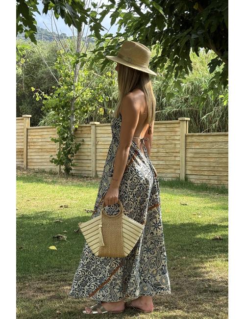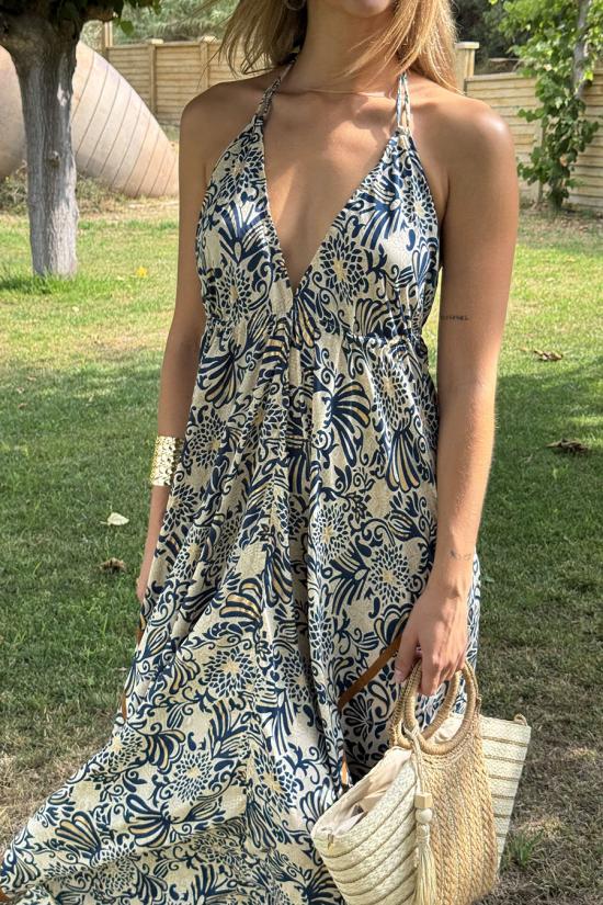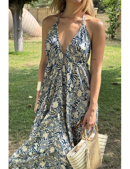 Vestido largo de estilo boho, con escote frontal en forma de V. Estampado con motivos florales. Atado al cuello y espalda y te lo puedes ceñir en la cintura. El escote es pronunciado en la espalda. Este vestido está confeccionado en un tejido sedoso especialmente suave y fresquito. Además tiene una caída preciosa, sienta de maravilla y es ideal para la época estival.