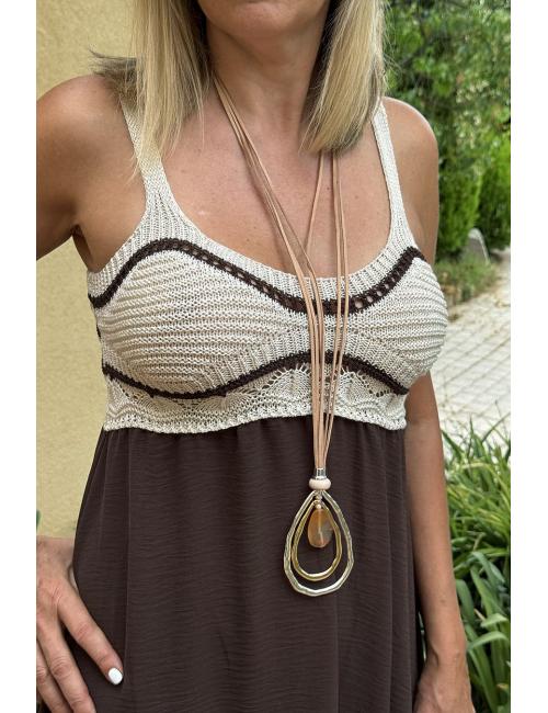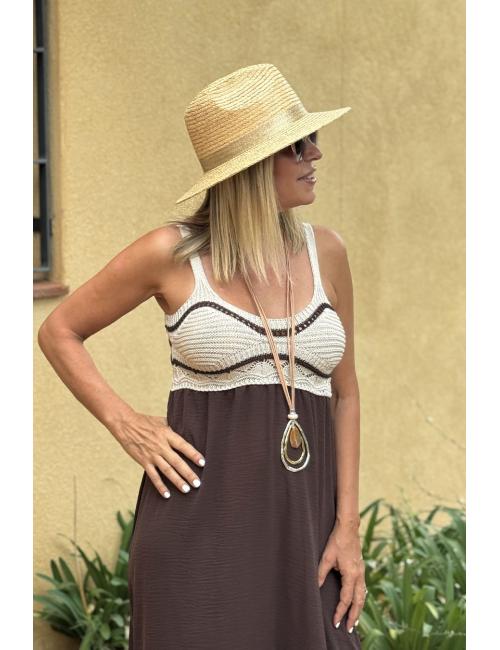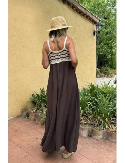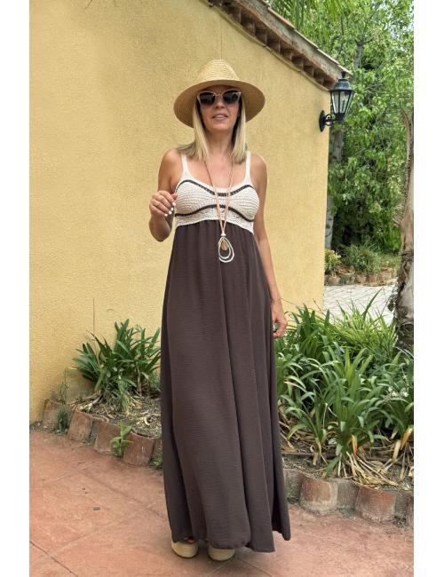 Vestido largo combi liso fluido y crochet en el pecho. Confeccionado con tejido crepé en la parte lisa y ganchillo de contura hacia arriba. Incluye dos tirantes finos.
