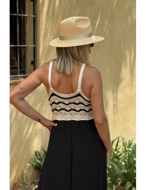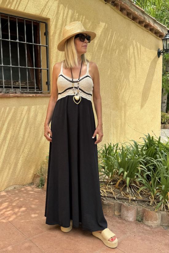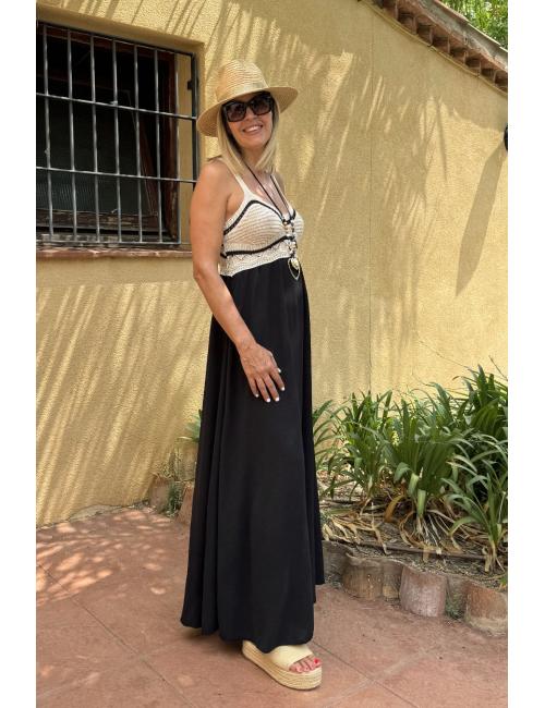 Vestido largo combi liso fluido y crochet en el pecho. Confeccionado con tejido crepé en la parte lisa y ganchillo de contura hacia arriba. Incluye dos tirantes finos.