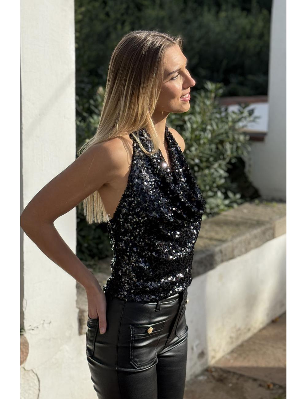 Crop top género de lentejuelas, tiene el cuello caído en forma de cascada con cierre de dos botones al cuello.