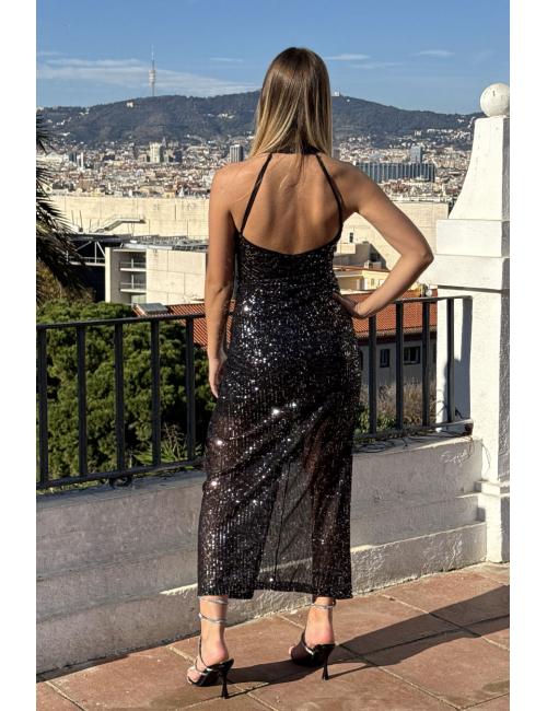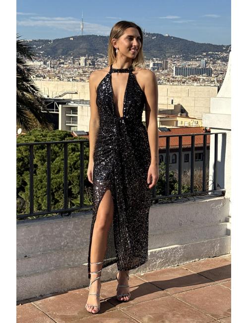 Vestido midi confeccionado en lentejuelas. Tiene cuello halter con cierre de dos botones en detrás. Escote pronunciado y abertura delante.