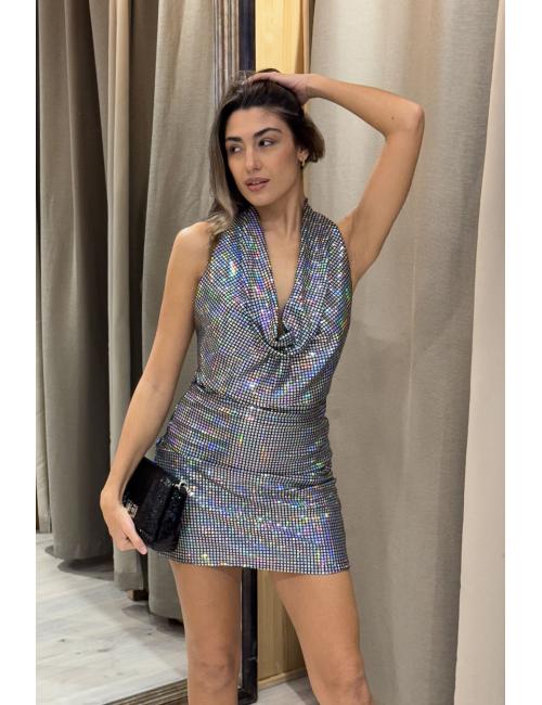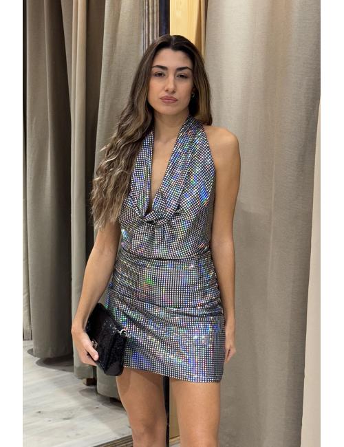 Vestido mini de lentejuelas cuadradas tipo bola de discoteca. Espalda descubierta y escote delante tipo cascada. Cremallera detrás.