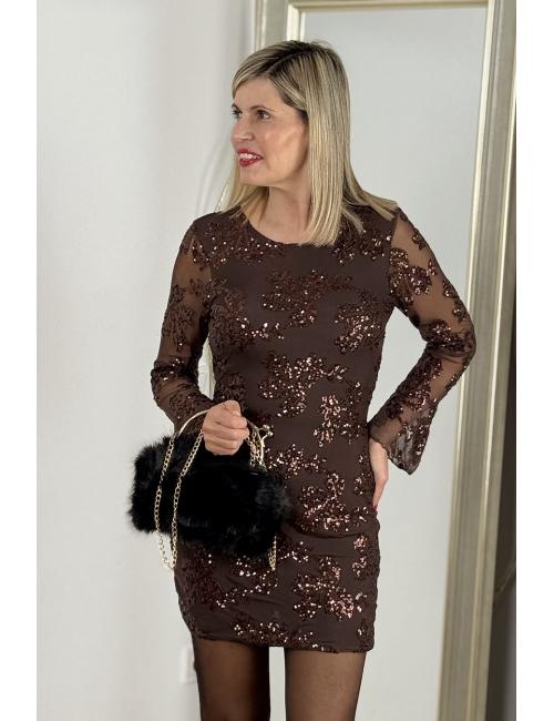Vestido corto de lentejuelas elástico confeccionado en dos tejidos. Mangas acampanadas semi-transparentes, cuello redondo cerrado detrás mediante un botón. Puro glamour para tus fiestas y celebraciones especiales con este vestido elegante y sofisticado.