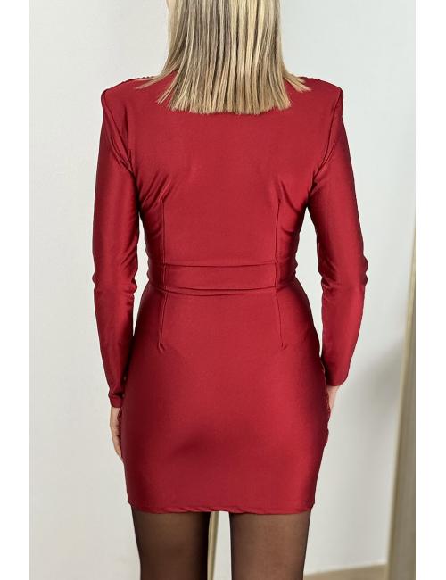 Vestido corto de manga larga con hombreras. Elástico, confeccionado en lycra. Hombreras. Espalda cubierta lisa y pecho con fruncido cruzado de doble capa.