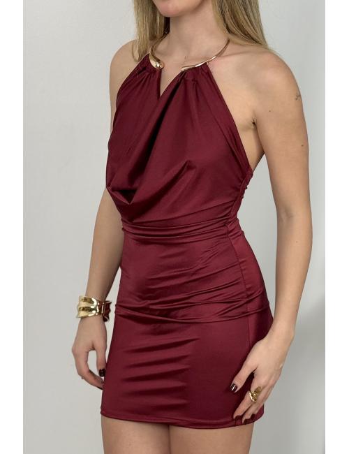Vestido corto sin mangas confeccionado con tejido satinado brillante elástico. Detalle de collar asimétrico dorado que sujeta el vestido desde el cuello. Escote cascada y espalda descubierta.