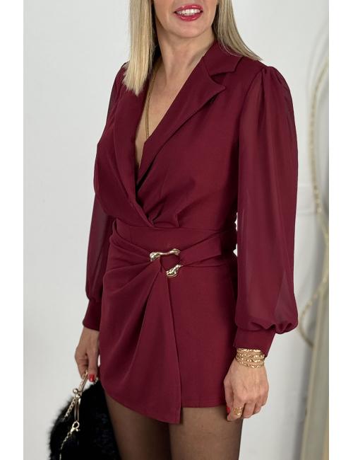 Mono corto de manga larga confeccionado en crepe y gasa en las mangas. Diseño blazer cruzada y mangas abullonadas. Detalle de hebilla metálica dorada en cintura.