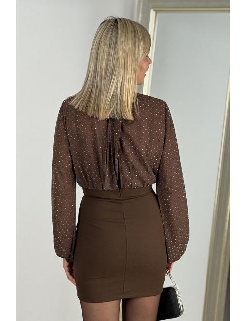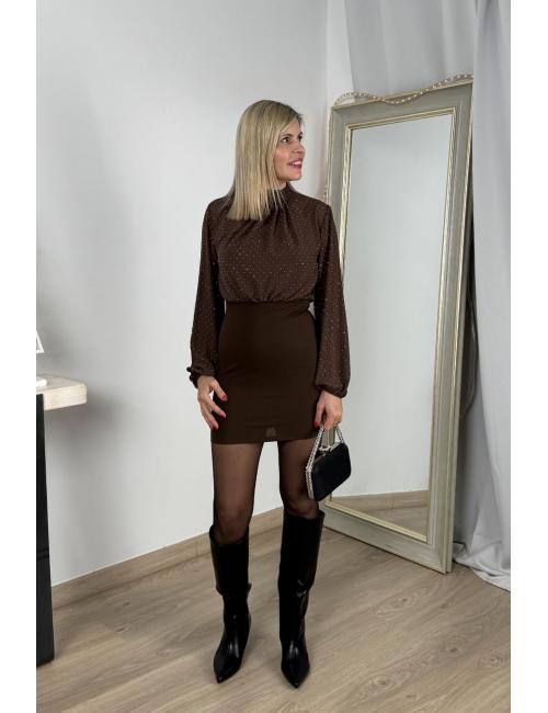Vestido corto de manga larga confeccionado en dos tejidos: crepón en la falda y escote con tirantes y gasa en blusa semi transparente forrada de lentejuelas mini. Cuello halter y cierre con cremallera invisible en la espalda.