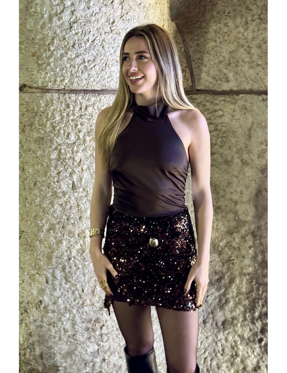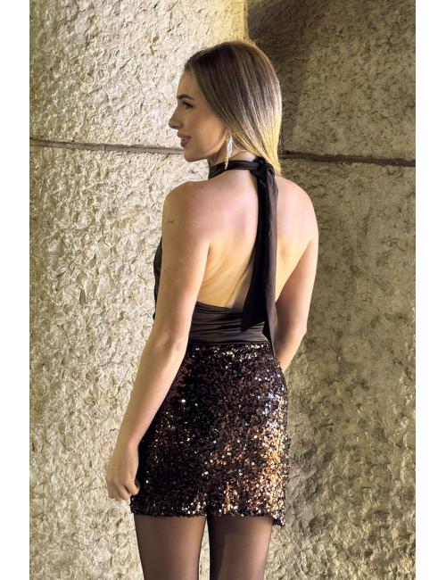 Vestido corto sin mangas confeccionado con lycra en la parte superior y lentejuelas en la parte inferior. Cuello halter atado a la espalda mediante lazo. Espalda descubierta y detalle de pieza dorada decorativa en la falda a modo de hebilla. Glamour total para tus looks de fiesta con este vestido elegante, sofisticado y original.