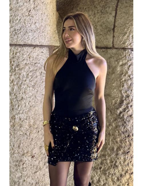 Vestido corto sin mangas confeccionado con lycra en la parte superior y lentejuelas en la parte inferior. Cuello halter atado a la espalda mediante lazo. Espalda descubierta y detalle de pieza dorada decorativa en la falda a modo de hebilla. Glamour total para tus looks de fiesta con este vestido elegante, sofisticado y original.