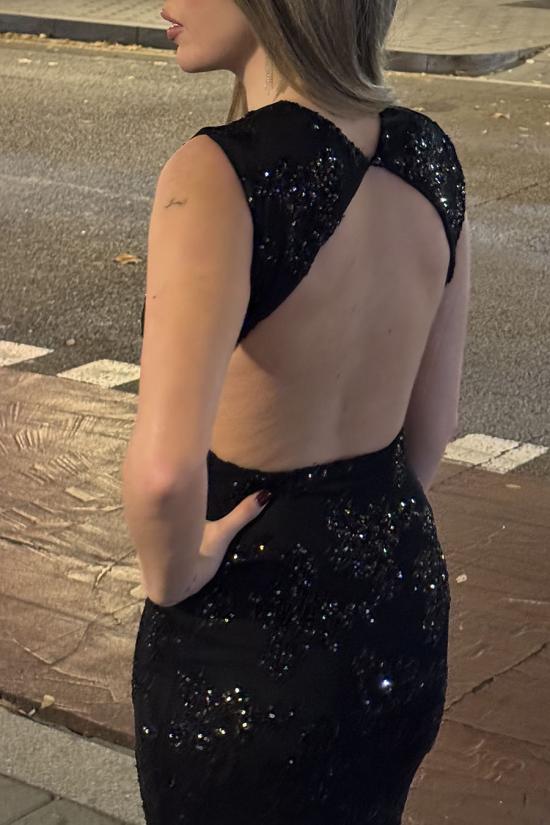 Vestido midi sin mangas confeccionado con tejido de lentejuelas. Vuelo en bajo y forro interior de punto fino. Cuello redondo con cierre detrás mediante botón. Espalda descubierta.