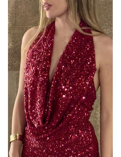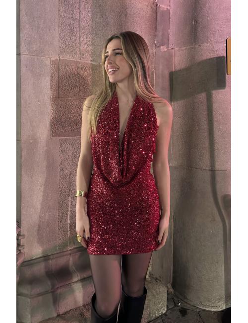 Vestido corto sin mangas confeccionado con tejido de lentejuelas elástico. Corte slim y forro interior de punto fino. Escote cascada y espalda descubierta.