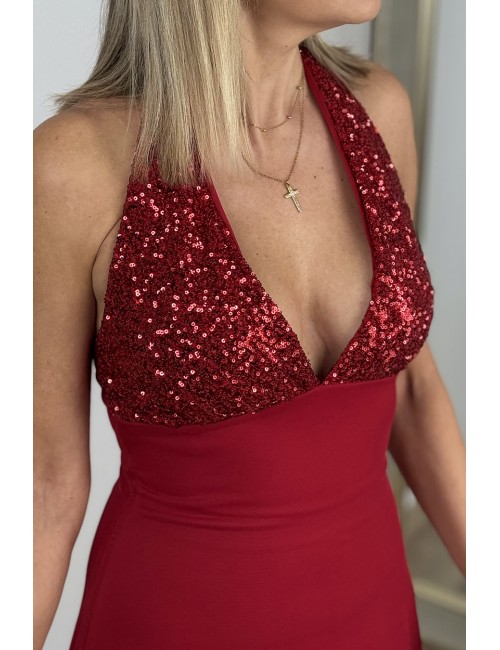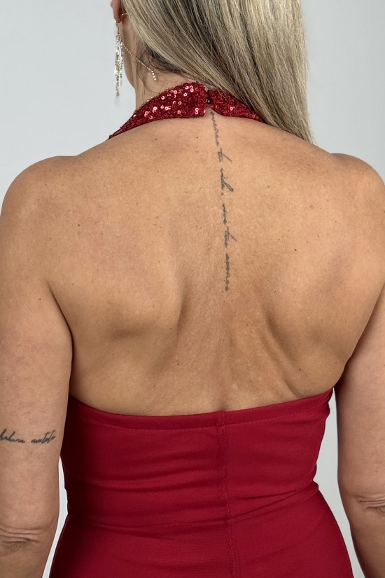 Vestido corto elástico confeccionado en tul y lentejuelas. Escote delante en V y espalda descubierta. Cuello atado detrás mediante dos botones. Forro interior anti-transparencias.