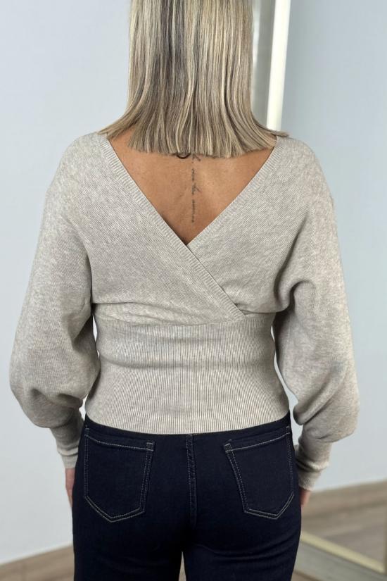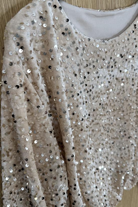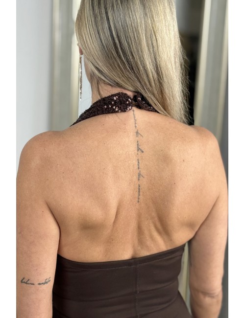 Vestido corto elástico confeccionado en tul y lentejuelas. Escote delante en V y espalda descubierta. Cuello atado detrás mediante dos botones. Forro interior anti-transparencias.