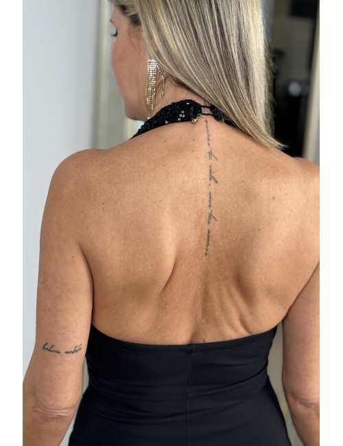 Vestido corto elástico confeccionado en tul y lentejuelas. Escote delante en V y espalda descubierta. Cuello atado detrás mediante dos botones. Forro interior anti-transparencias.