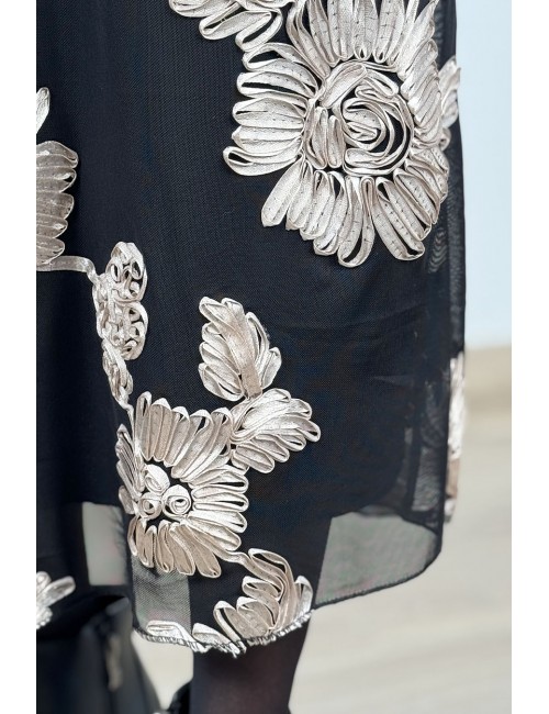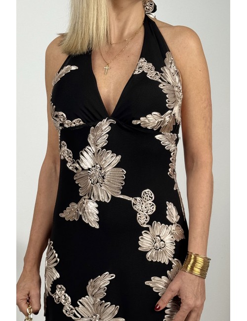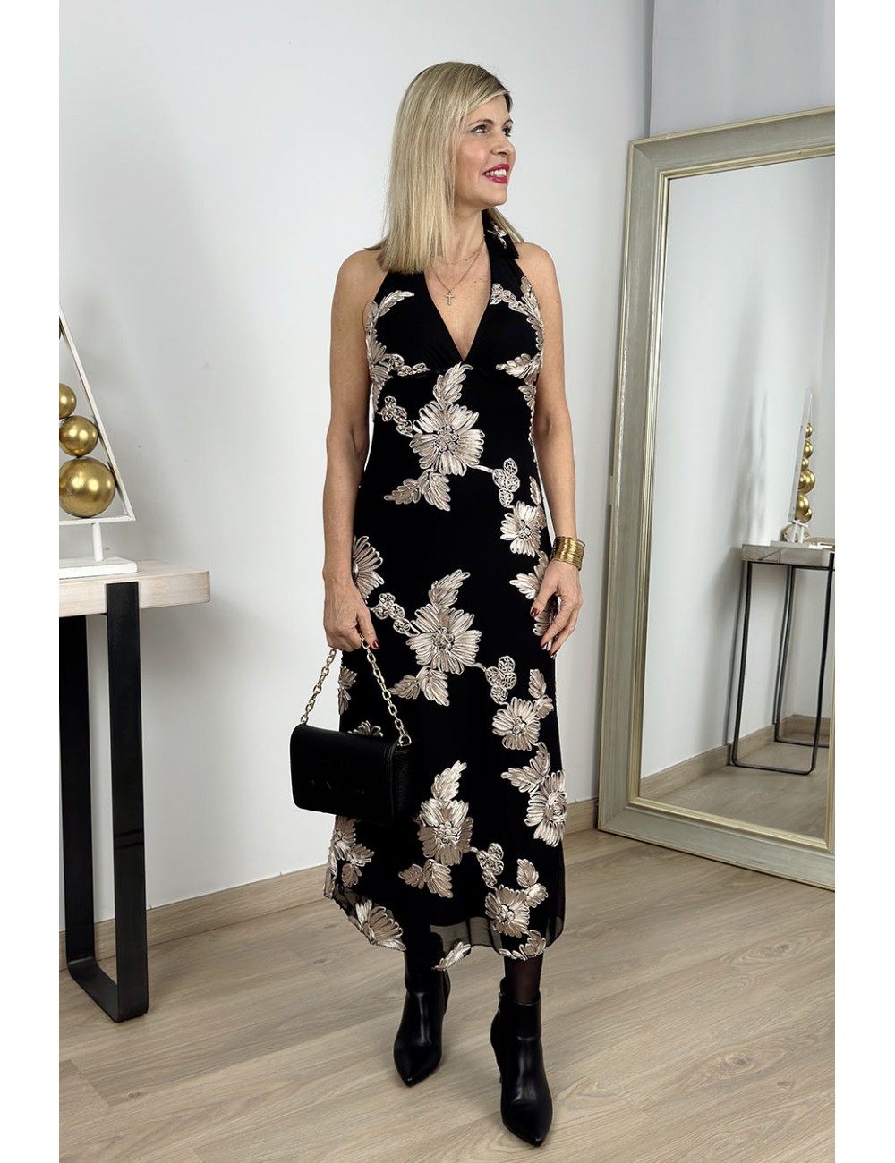 Vestido largo elástico confeccionado en tul con detalle de flores de cinta de raso satinado. Escote en V y espalda descubierta con cuello atado detrás. Copas en el pecho y forro interior.