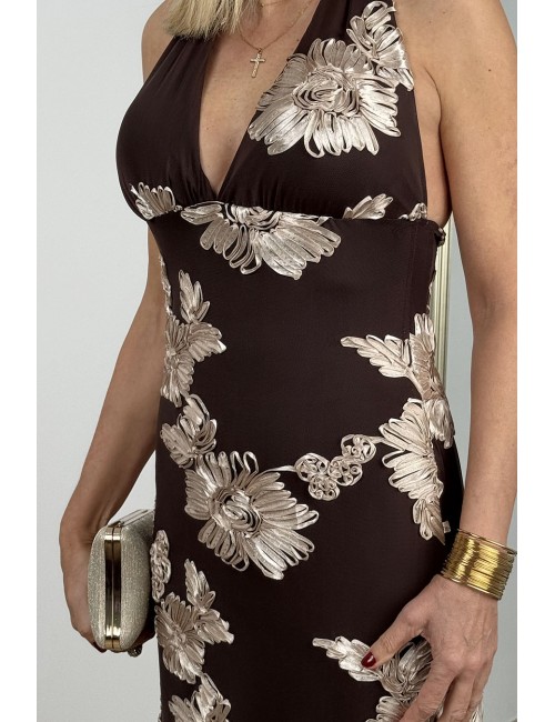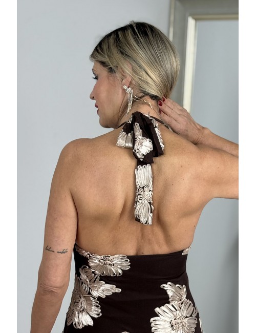 Vestido largo elástico confeccionado en tul con detalle de flores de cinta de raso satinado. Escote en V y espalda descubierta con cuello atado detrás. Copas en el pecho y forro interior.