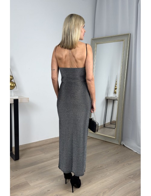 Vestido largo elástico confeccionado en lurex brillante. Tirantes finos, escote en cascada y espalda descubierta. Detalle de abertura lateral.