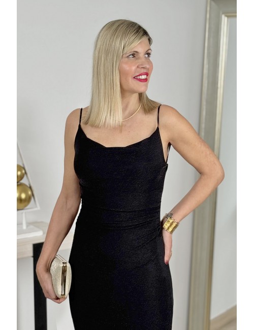 Vestido largo elástico confeccionado en lurex brillante. Tirantes finos, escote en cascada y espalda descubierta. Detalle de abertura lateral.