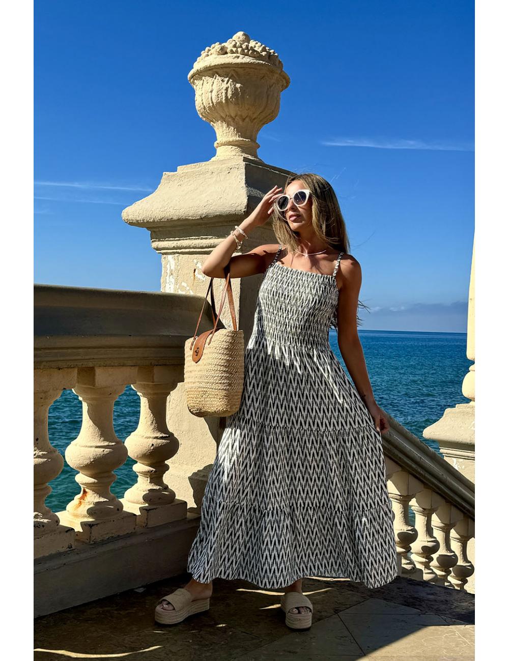 Vestido largo estampado con print zig-zag a contraste sobre fondo blanco. Falda con vuelo y entallado de cintura hacia arriba gracias a su textura elástica nido de abeja delante y en la espalda, que lo hace adaptable a varias tallas.