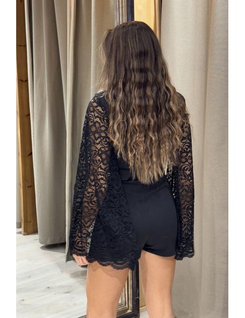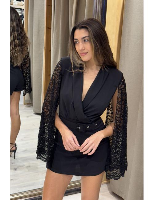 Vestido mini que combina tejido liso elástico con mangas abiertas de blonda. Cuello con solapa cruzada acabado en V. Cinturón textil para un mejor ajuste. Apariencia de falda delante y short detrás.