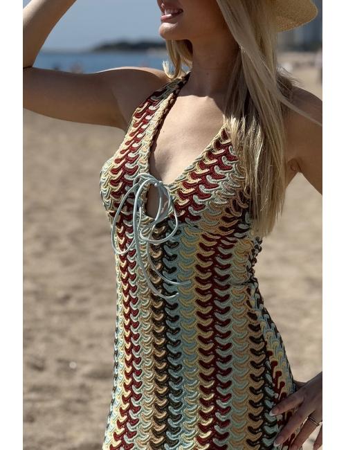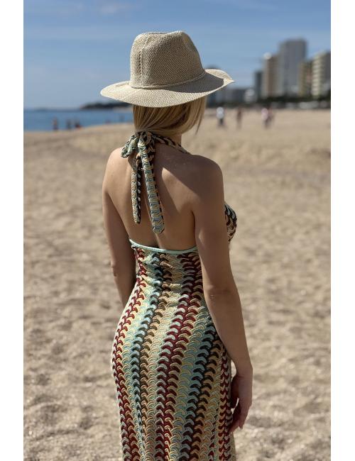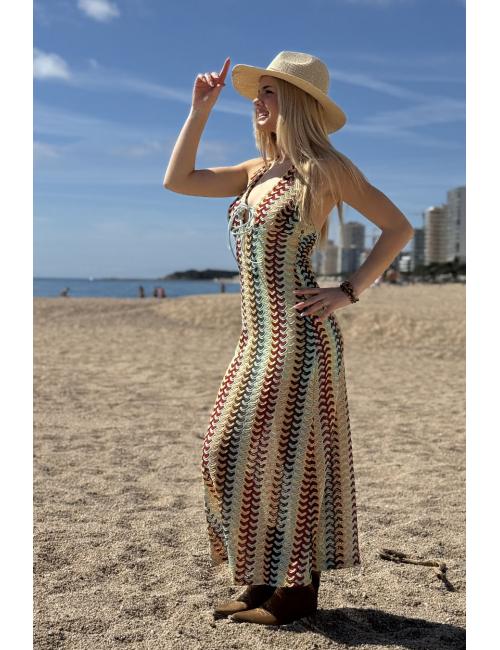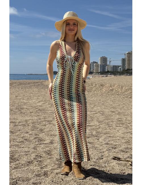 Vestido midi multicolor confeccionado en tejido crochet. Cuello en V con detalle de lacito en el escote. Tirantes al cuello atados detrás. Lleva forro interior.