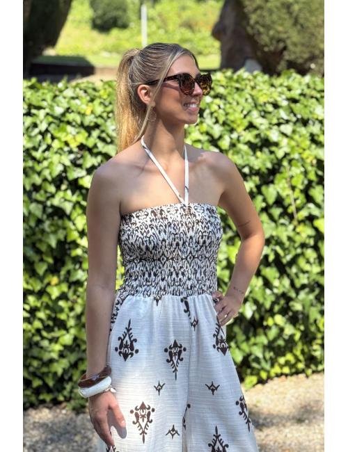 Mono fluído confeccionado en tejido crepé. Escote palabra de honor y parte superior nido de abeja elástico. Ajuste mediante dos tiras que parten del pecho y se anudan en el cuello. La parte inferior es diseño palazzo.