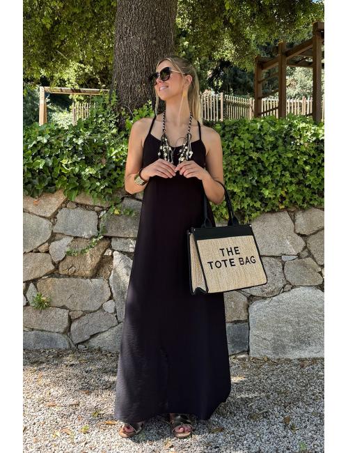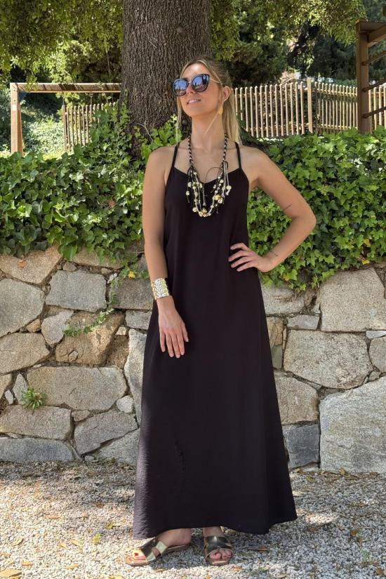 Vestido largo fluído confeccionado en símil lino. Tirantes finos y unidos en la espalda mediante tres pequeños abalorios de madera. Goma en la espalda que lo hace adaptable a varias tallas.