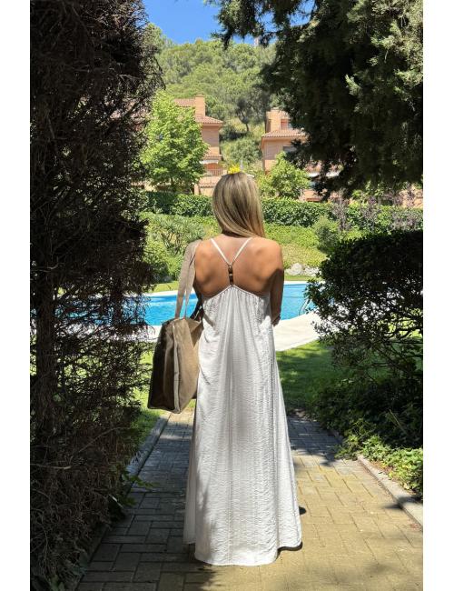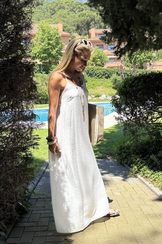 Vestido largo fluído confeccionado en símil lino. Tirantes finos y unidos en la espalda mediante tres pequeños abalorios de madera. Goma en la espalda que lo hace adaptable a varias tallas.