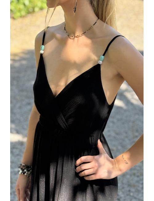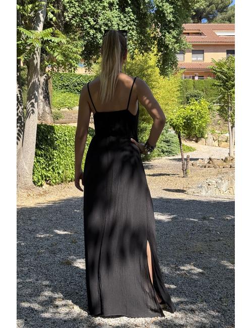 Vestido largo fluído confeccionado en bámbula. Tirantes finos con detalle delante de dos pequeños abalorios color turquesa y blanco. Goma en la cintura que lo hace adaptable a varias tallas.
