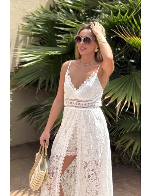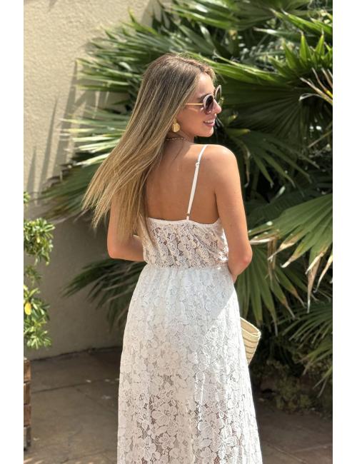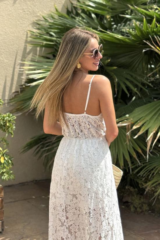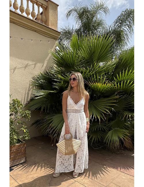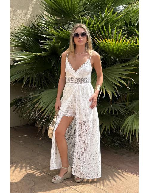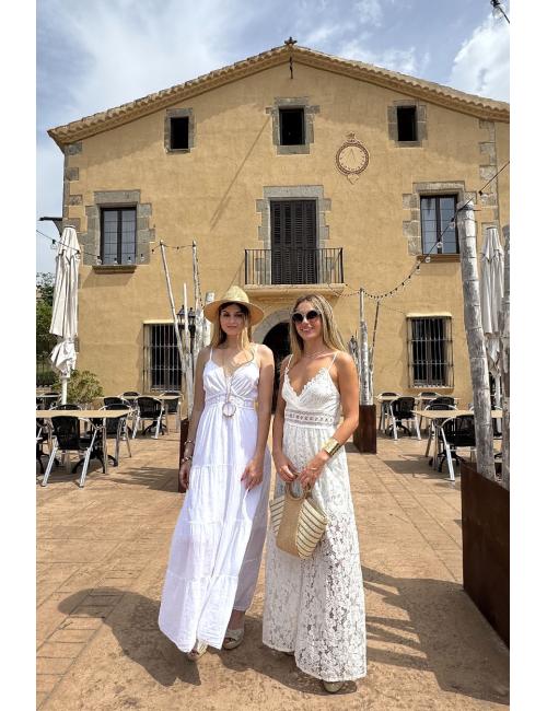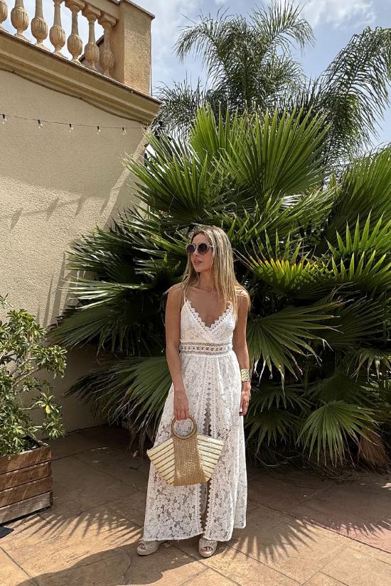 Vestido con short debajo de inspiración mediterránea. Confeccionado en tul bordado, tiene un detalle de guipur calado debajo del pecho, escote en V y tirantes finos regulables en altura.