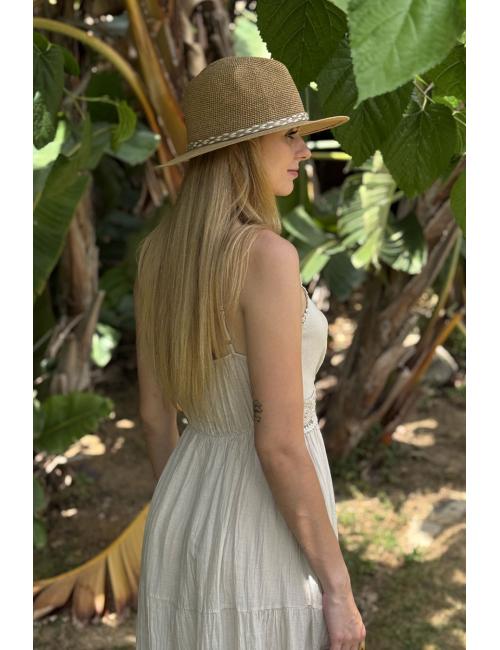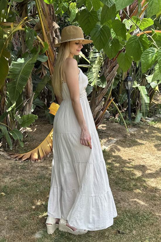 Vestido largo de inspiración ibicenca con volantes confeccionado en algodón con detalle bordado de guipur calado debajo del pecho. Escote en V y tirantes finos regulables en altura. Forro interior anti-transparencias.