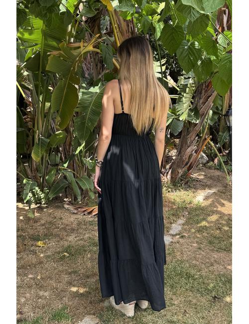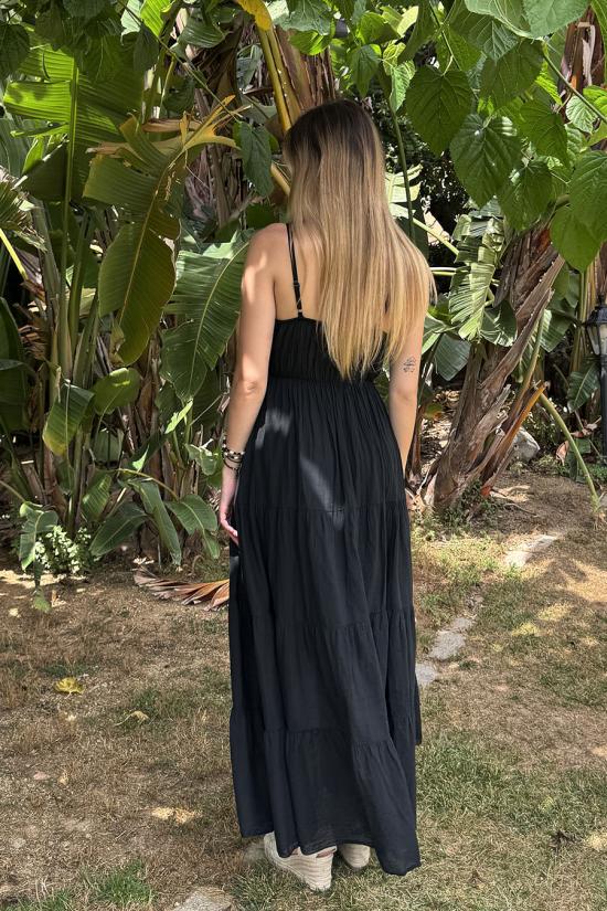 Vestido largo de inspiración ibicenca con volantes confeccionado en algodón con detalle bordado de guipur calado debajo del pecho. Escote en V y tirantes finos regulables en altura. Forro interior anti-transparencias.