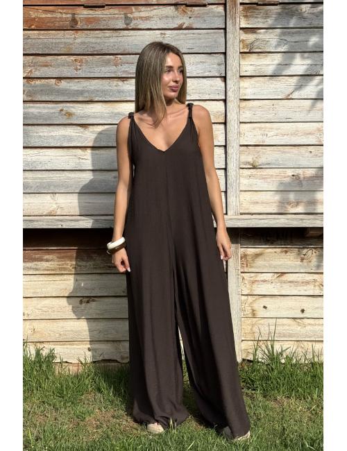 Mono oversize largo fluído con tirantes, confeccionado en tejido crepe. Tirantes finos, amplio escote en la espalda y escote delante en V.