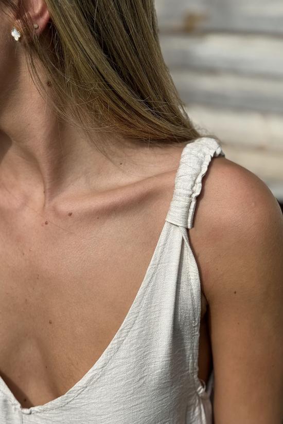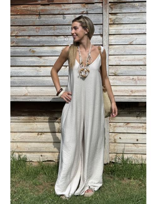 Mono oversize largo fluído con tirantes, confeccionado en tejido crepe. Tirantes finos, amplio escote en la espalda y escote delante en V.