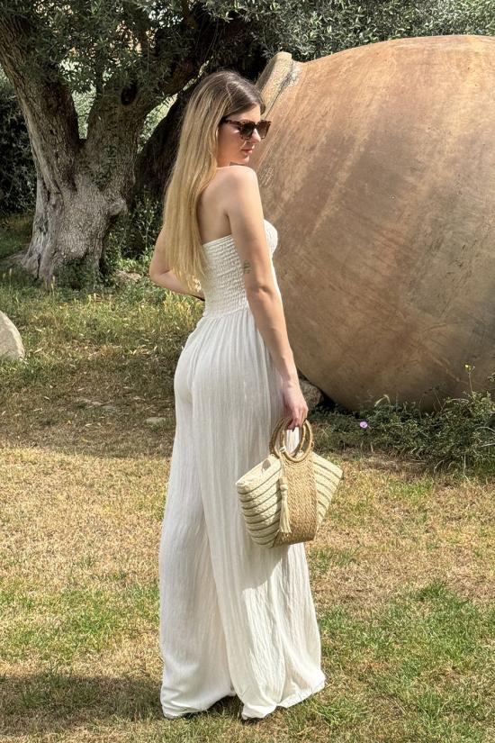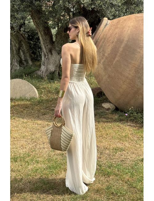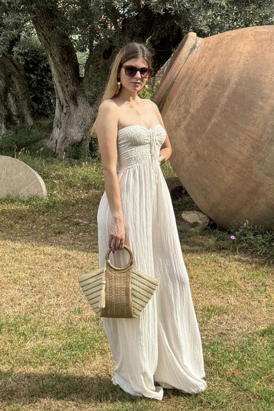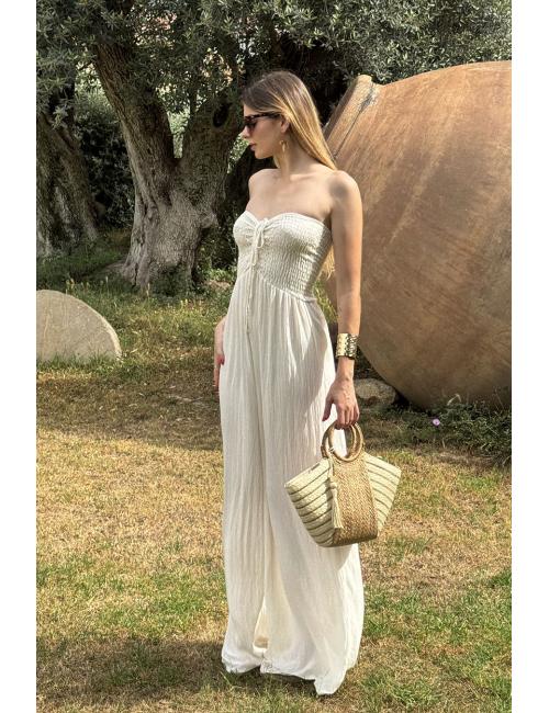Mono oversize largo fluído confeccionado en tejido bámbula. Escote palabra de honor y pecho elástico nido de abeja elástico con dos tiras que pueden atarse como un lazo o atadas al cuello.