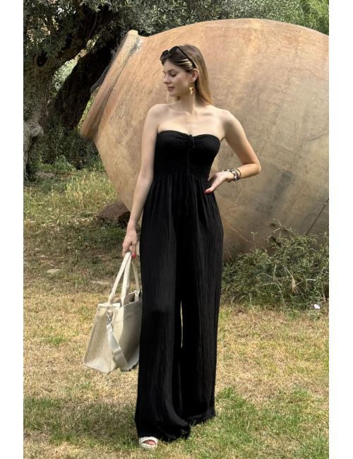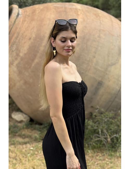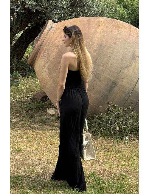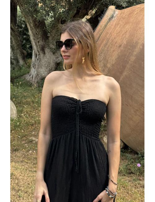 Mono oversize largo fluído confeccionado en tejido bámbula. Escote palabra de honor y pecho elástico nido de abeja elástico con dos tiras que pueden atarse como un lazo o atadas al cuello.