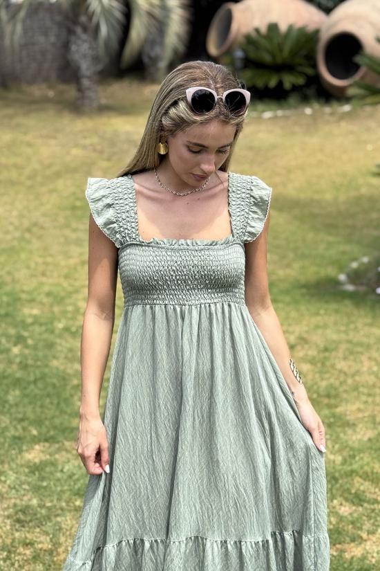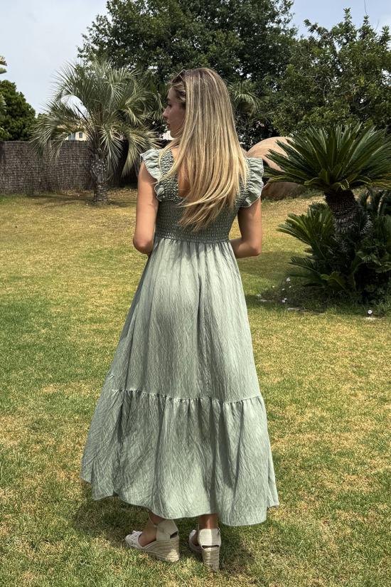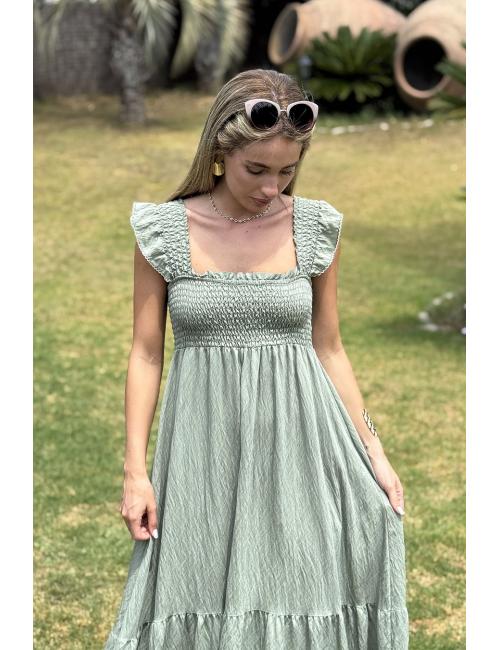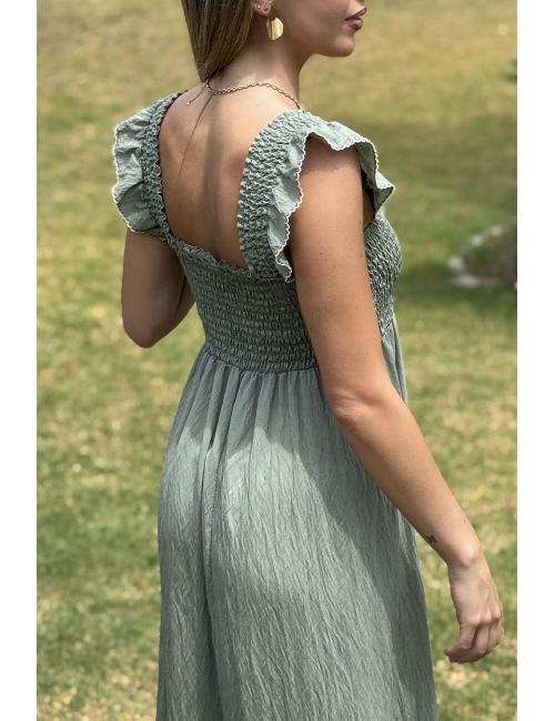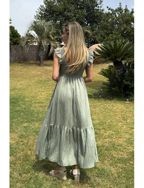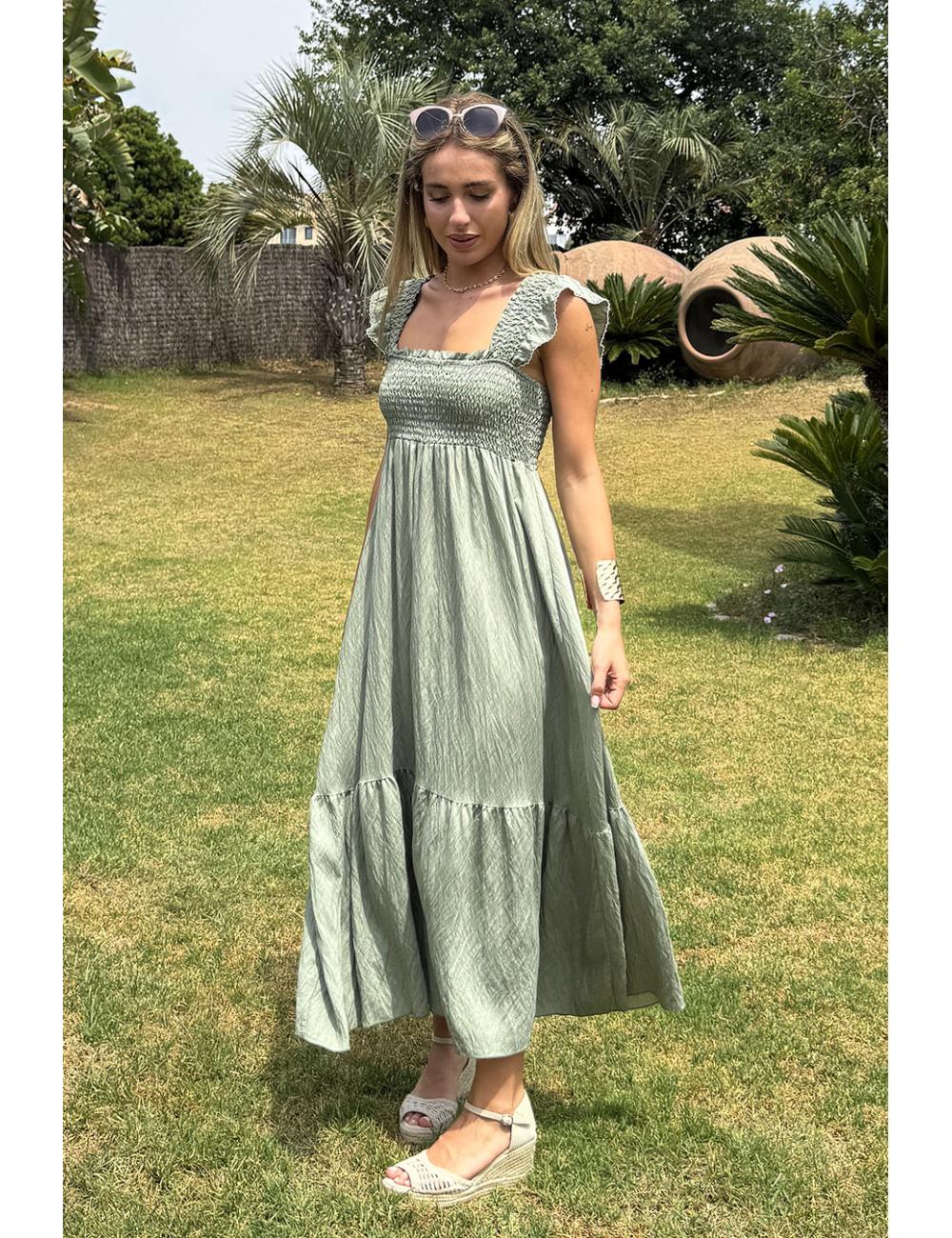 Vestido largo con vuelo, sin mangas y detalle en hombros ribeteados a contraste. Pecho confeccionado con nido de abeja elástico que lo hace adaptable a varias tallas. Escote en recto delante y en la espalda.