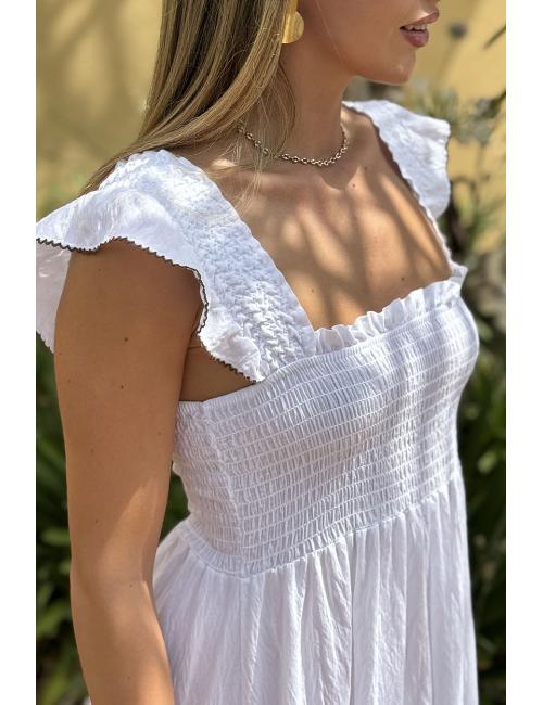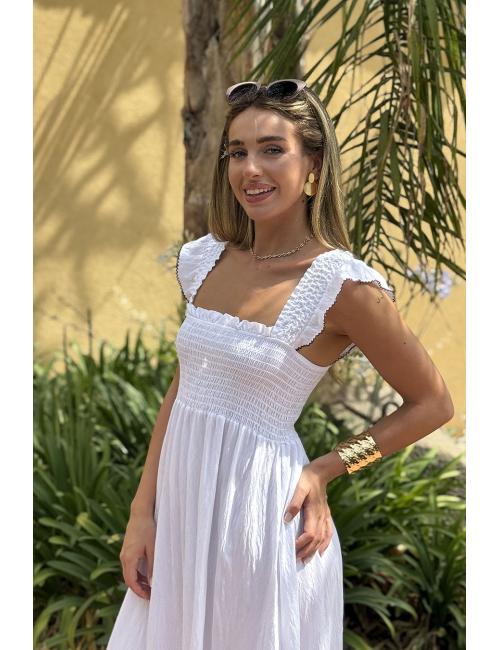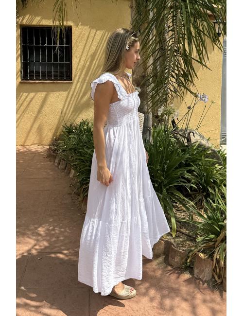 Vestido largo con vuelo, sin mangas y detalle en hombros ribeteados a contraste. Pecho confeccionado con nido de abeja elástico que lo hace adaptable a varias tallas. Escote en recto delante y en la espalda.