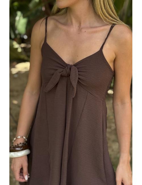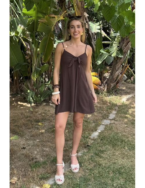 Mono corto fluído confeccionado en tejido crepe con un nudo en el pecho y tirantes finos. De cintura hacia arriba en la parte trasera es de nido de abeja elástico que lo hace adaptable a varias tallas.