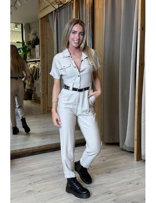 Mono de inspiración safari largo confeccionado en tejido fino. Es de manga corta. Cierre mediante botones y cremallera. Incluye trabillas, cuello camisero, dos bolsillos frontales, dos laterales y uno detrás.