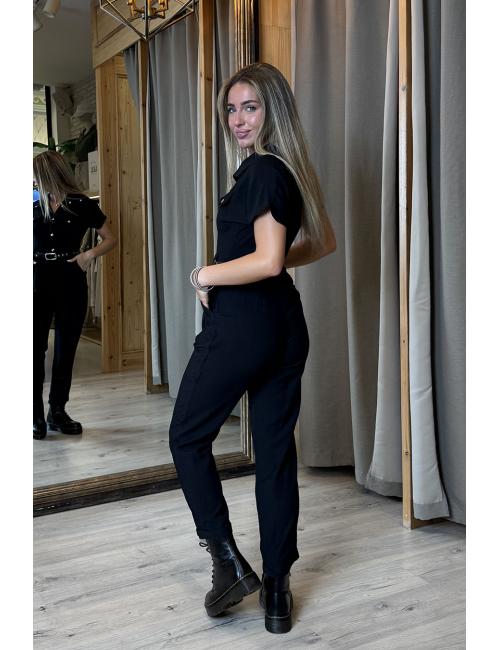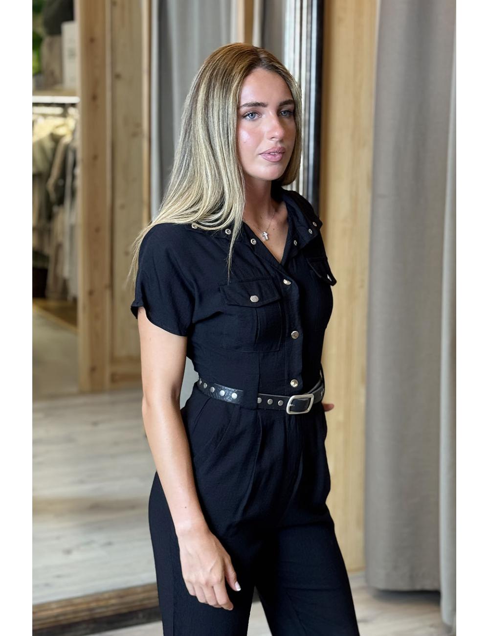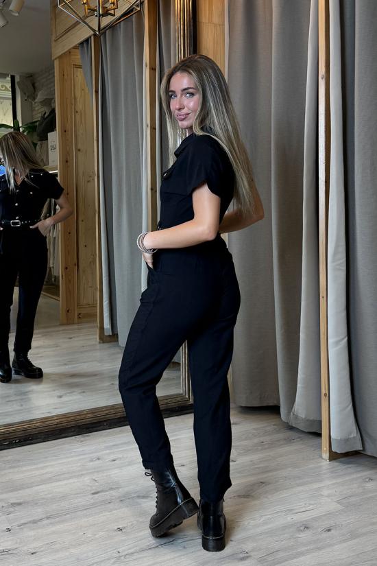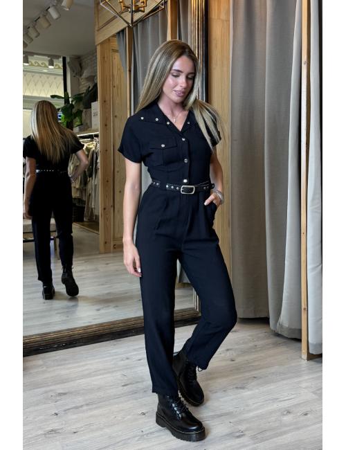 Mono de inspiración safari largo confeccionado en tejido fino. Es de manga corta. Cierre mediante botones y cremallera. Incluye trabillas, cuello camisero, dos bolsillos frontales, dos laterales y uno detrás.