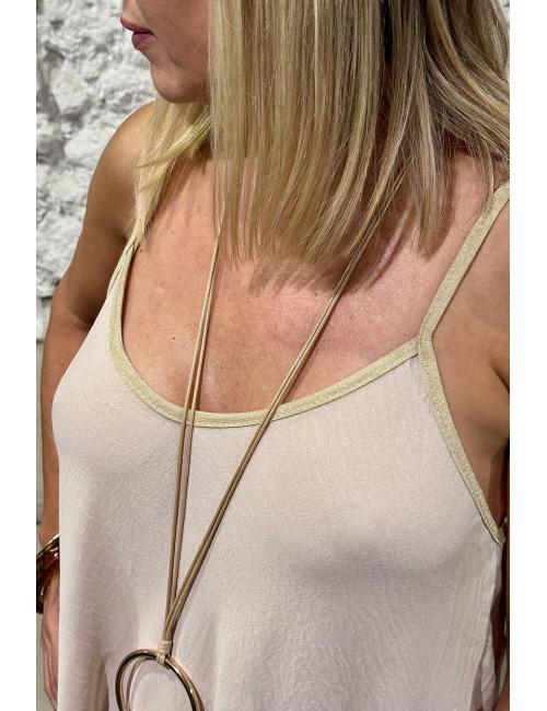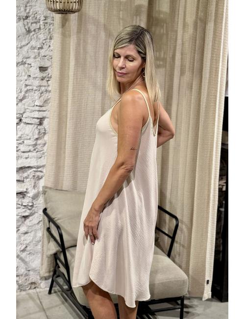 Vestido corto oversize confeccionado en tejido fino crepé. Tirantes finos con detalle de ribete dorado. Escote en U delante y abierto detrás.