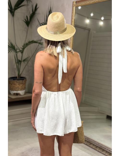 Mono corto fluído sin mangas confeccionado en tejido crepé, cintura elástica y falda con vuelo. Tiene apariencia de vestido. Abierto delante y cierre mediante lazo. Va atado detrás al cuello. Espalda descubierta hasta la cintura.