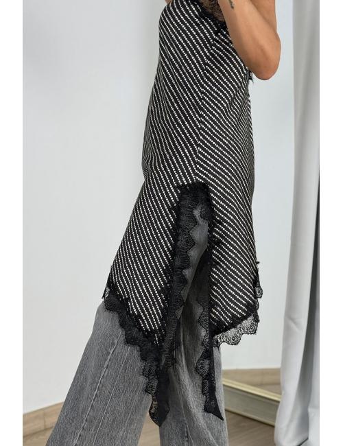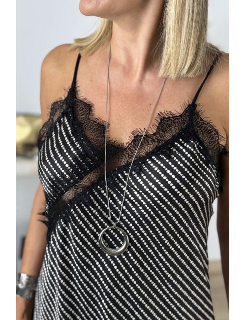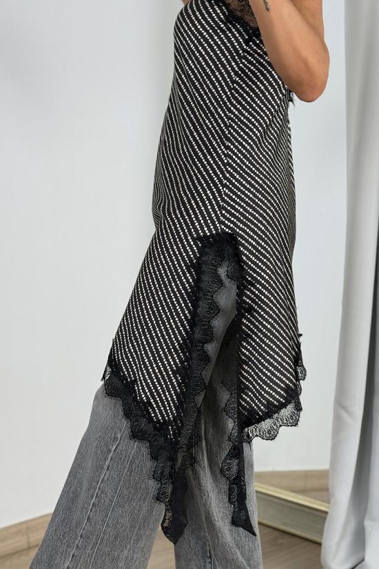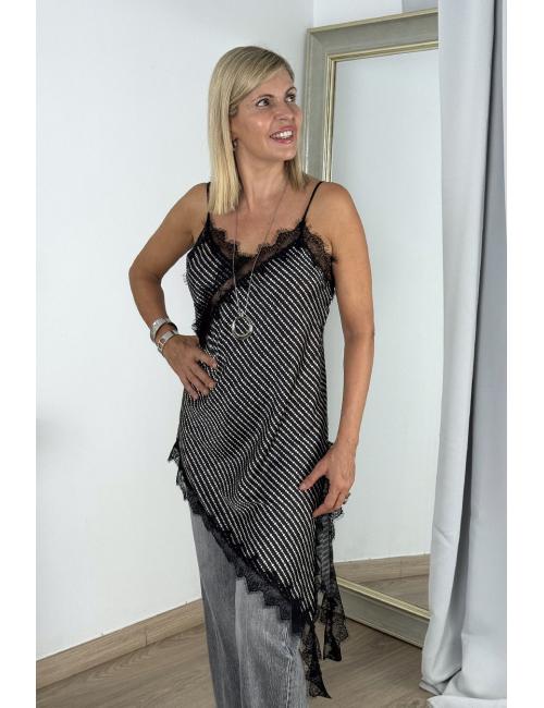 Vestido lencero de raso satinado. Bajo asimétrico y abertura lateral. Cuello en V, tirantes finos y detalle de puntilla de blonda en bajo y escote. El vestido más versátil de la temporada, ideal para tus looks de día con pantalones o leggins y de noche tal cual, o con unas simples medias.