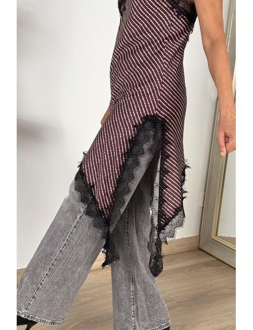 Vestido lencero de raso satinado. Bajo asimétrico y abertura lateral. Cuello en V, tirantes finos y detalle de puntilla de blonda en bajo y escote. El vestido más versátil de la temporada, ideal para tus looks de día con pantalones o leggins y de noche tal cual, o con unas simples medias.