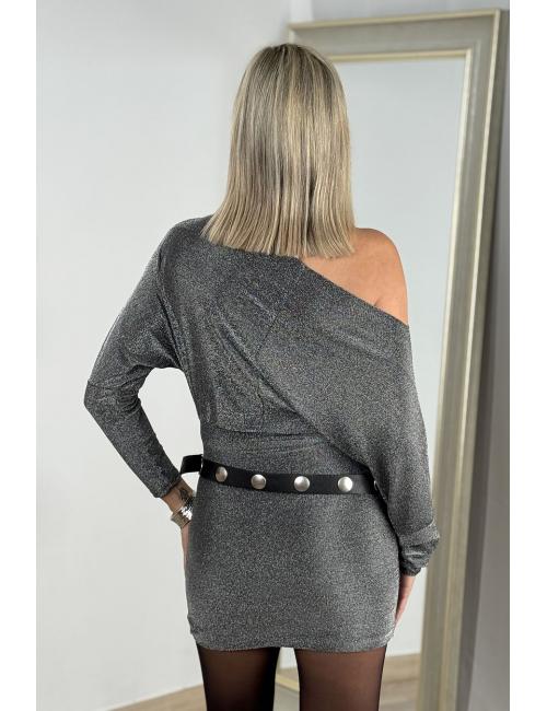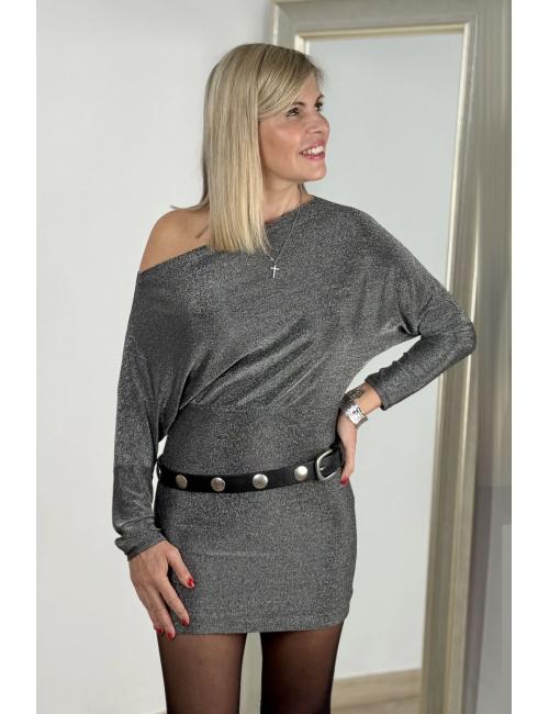 Vestido corto de manga larga confeccionado en punto lurex elástico brillante. Mangas murciélago y cuello semi-barca.